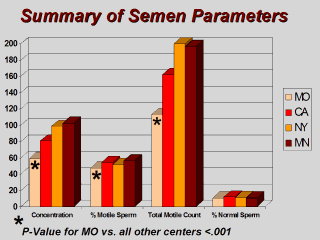 As seen graphically in this slide, Missouri differed significantly from the other centers in all semen parameters except morphology |