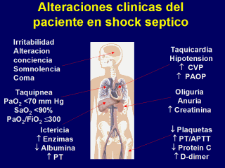 of organ dysfunction. The illustration of the patient on this slide has arrows pointing to various organs that might provide clues to the presence of organ dysfunction. Indications of organ dysfunction include: Hematological: thrombocytopenia, abnormal coagulation tests, decreased levels of Protein C, increased D-dimers |
