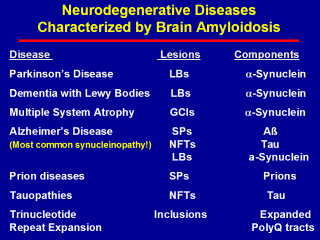 Alpha-synuclein is well-known for its key role in Parkinson disease, but it is also found in the brain pathology of Alzheimer disease and half a dozen other neurologic disorders. Alpha-synuclein deposits may occur by them-selves, but also frequently co-localize with deposits of tau and amyloid-beta.