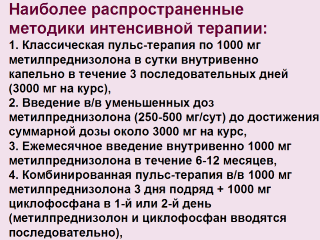 месяцев, 6. Ежемесячное в/в введение 1000 мг циклофосфана в течение 12 месяцев. Снижать дозу перорального преднизолона непосредственно после проведения пульс-терапии глюкокортикостероидами не рекомендуется (возможен временный синдром отмены). |