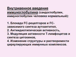 | Применение иммуноглобулинов внутривенно - метод выбора при выраженной стойкой тромбоцитопении, при резистентности к терапии люпус-нефрита. Рекомендуется введение препарата в дозе 400-500 мг/кг в сутки в течение 3-5 последовательных дней. затем 1 раз в месяц в течение 6-12 месяцев. |