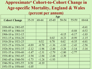 | a) Estimated from age-specific mortality in three-year periods in which each cohort is the dominant one; e.g. age 35-39, the dominant cohort in 1959-61 is the birth cohort 1921-25 |