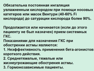 Можно выделить две рекомендуемые схемы для применения ГКС: 1. Эксперты EPR-2 рекомендуют назначать системные ГКС (преднизон, преднизолон, метилпреднизолон) по 120-180 мг/сутки перорально в три или четыре приема в течение 48 часов, затем 60-80 мг/сутки до тех пор, пока ПСВ не достигнет 70% от должного или индивидуально лучшего показателя, после чего сохраняется 40-60 мг в сутки перорально в один или два приема. Возможно применение гидрокортизона 200 мг внутривенно. 2. Британским торакальным и Канадским обществами рекомендуются другие дозы: 30-60 мг/сутки преднизолона перорально или гидрокортизон 200 мг внутривенно каждые 6 часов. Назначенную суточную дозу препарата сохраняют без снижения в течение 7-14 дней или до исчезновения ночных симптомов бронхиальной астмы, нормализации физической активности, повышения ПСВ до лучших для пациента значений (80% от максимального показателя), после чего следует одномоментная отмена препарата (если пациент не получал до этого системные ГКС в качестве базистной терапии). При этом особо указывается на возможность одномоментной отмены препарата при длительности терапии ГКС 15 дней и менее. |
