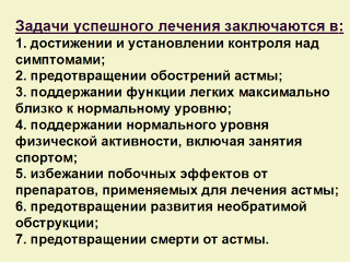 Приведенные задачи терапии отражают новое понимание астмы как заболевания и принципов ее лечения. С учетом того, что астма - это хроническое воспалительное заболевание, было показано, что любую астму, кроме легкой интермиттирующей, можно более эффективно контролировать лечением, направленным на подавление и обратимость воспаления, чем лечение только острого бронхоспазма и связанных с ним симптомов.