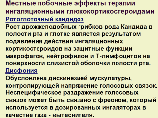 Наиболее часто дисфония встречается у пациентов, которые по роду деятельности имеют нагрузку на голосовые связки - учителя, лекторы и т.д. Таким образом, переносимость кортикостероидов в рекомендуемых дозах является хорошей, а риск нежелательных явлений (кандидоз полости рта, дисфония и др.) компенсируется их высокой эффективностью. |