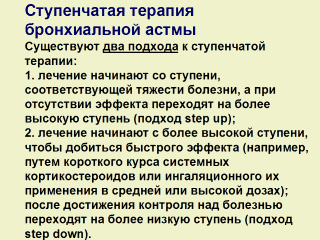 Несмотря на отсутствие результатов прямых сравнительных исследований двух подходов, эксперты полагают, что лучше придерживаться тактики step down, которая обеспечивает быстрое подавление воспаления в дыхательных путях и, в конечном итоге, позволяет контролировать течение болезни более низкими дозами противовоспалительных препаратов. Переход на предыдущую ступень лечения должен быть постепенным, учитывая возможность обострения астмы. Как правило, в первую очередь, отменяют препарат, который был назначен последним. По мнению экспертов, дозу ингаляционных кортикостероидов можно снижать примерно на 25% каждые 2-3 месяца до минимальной дозы, достаточной для поддержания контроля над астмой.