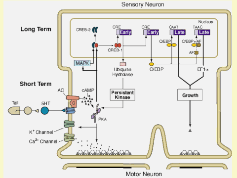 | Long-term sensitization of the gill-withdrawal reflex of Aplysia leads to two major sets of changes in the sensory neurons of the reflex: persistent activity of protein kinase A and (2) the growth of new synaptic connections. |