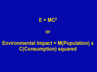 | Einstein was a brilliant scientist , and his relativity theorem has meaning to today's subject. With apologies to the master, let me redefine the terms of the caution., The environmental impact of humanity is a product of the population x consumption squared. We can address the problem from either end-and hopefully both. |