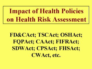 In the United States, numerous federal laws have been enacted to protect public health by regulating exposure to potentially toxic materials. This type of regulatory process typically entails some health risk assessment (RA) for the material at issue, and an evaluation of the risk assessment’s outcome. The contributions of toxicology and epidemiology to RA were discussed briefly in previous slides. At least five federal health agencies are directly or indirectly involved in this type of RA (Office of Science and Technology Policy,1986). These are the Food and Drug Administration (FDA); the Consumer Product Safety Commission (CPSC); the Environmental Protection Agency (EPA); the National Institute for Occupational Safety and Health (NIOSH); and the Occupational Safety and Health Administration (OSHA).