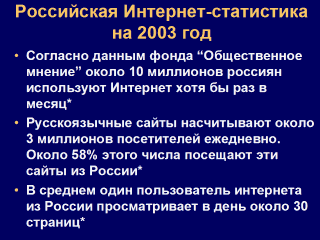 *www.rg.ru - Российская газета, январь 29, 2004 N12(3389), стр 11. К сожалению, российские интернет-пользователи (в среднем) до сих пор активно не интересуется сайтами, посвященными здоровью. |