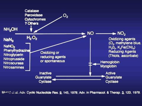 We began to examine other smooth muscle relaxants such as nitroglycerin, nitroprusside, hydrazines, etc. All of these agents increased cyclic GMP levels in several smooth muscle preparations, as well as other tissues, caused smooth muscle relaxation and activated guanylyl cyclase in most cell-free tissue extracts.