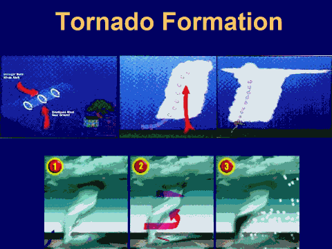 occur as the thunderstorm intensifies. Severe thunderstorms, which is an intense thunderstorm with winds of at least 60 mph, most likely produce tornados. Tornados form from thunderstorms which contain one or more updrafts (upward moving air which is warm and moist). These updrafts form towering cumulonimbus clouds which race upward and cool to form ice crystals (once they reach the anvil of the thunderstorm). Downdrafts of cold air aloft also occur as the thunderstorm intensifies. Severe thunderstorms, which is an intense thunderstorm with winds of at least 60 mph, most likely produce tornados. A thunderstorm capable of producing a tornado requires key ingredients such as: warm moist air, cold air aloft, sometime of wind shear(provides vertical motion) and instability high in the atmosphere, and a trigger. Tornadic thunderstorms usually occur where cold fronts clash with warm fronts over the Southern Great Plains. Rising updrafts begin to rotate as wind speed changes with direction and height in the thunderstorm. Along the surface of the earth a horizontal rotating column of air is moved vertically to form a shaft which rotates up through the thunderstorm. This area is where most tornados form. At some point this rotation becomes so intense that a rotating wall cloud descends from the thunderstorm eventually forming a vortex known as a funnel. This funnel extends downward to the ground where it is officially deemed a tornado. Tornados often are spawned by large thunderstorms known as a mesocylclone. A mesocyclone is a violent thunderstorm in which the entire storm or cell complex is rotating, which gives it a predisposition to produce tornados. Mesocyclonic thunderstorms are also known as "supercells". |
