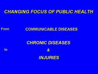 | Years ago, the leading causes of death were due to communicable diseases (Tb, polio, measles, etc.). However, with the advent of immunizations, the shift went from communicable diseases to chronic diseases(heart disease, cancer, stroke, diabetes) and injuries as the leading causes of death. |