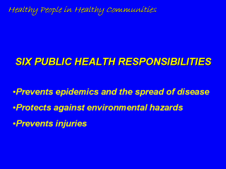 | Examples: Prevent epidemics and the spread of disease: Bacterial meningitis is a very contagious communicable disease that can result in death within a very short time frame. Public health staff respond to the initial report by launching an immediate investigation. This entails: 1) interviewing the patient, and all close contacts; 2)determining who needs preventive treatment; 3) providing preventative treatment with antibiotics, if necessary; 4) providing appropriate health education to involved parties and the public; and 5) assuring appropriate treatment for those infected. Playground safety is an example of both environmental hazards and injury prevention. Public health staff are trained and certified to examine playgrounds for potential injury hazards, and make appropriate recommendations. |