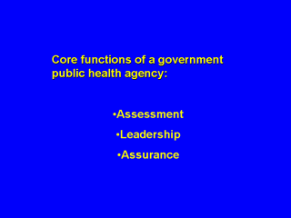 | Responds to disasters and assists communities in recovery: Example: toxic spills in the community – public health staff partner with first responders and other emergency and safety personnel. Assure the quality and accessibility of health services: collaborating with key stake holders,community representatives, and providers to assure services are provided to those most in need, e.g., healthy community partnerships These functions relate to the major steps in problem solving: Identify the