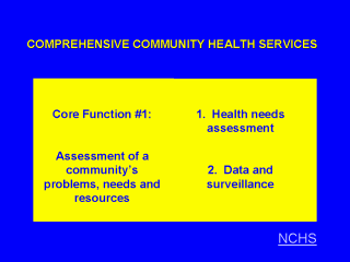 | This slide and the next two slides indicate how the corefunctions are actually translated into activities and/or services delivery. Public health departments assess the health needs of their communities in a variety of creative ways. In Pennsylvania, the PADivision of Health Statistics publishes a variety of reports gleaned from death, birth and termination of pregnancy reports. Many states also the national health surveys and databases from the National Center for Health Statistics. Other data sources come from the PA Department of Health departments, the Pennsylvania State Data Center of Pennsylvania State University, and miscellaneous registries and/or surveys. Local data can be found from planning commissions,hospitals, school districts, partnerships and community-based organizations. Local public health departments can also conduct their own surveys or request data tapes for analysis from the state data center. |