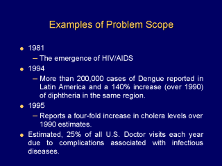 The emergence of HIV/AIDS in 1981, increases in dengue and diphtheria cases in Latin America, increases in cholera cases all serve to illustrate the problematic nature of infectious disease.