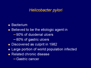 Helicobacter pylori H. pylori is an excellent example of how an infectious organism is related to a chronic disease, in this case gastric cancer. |