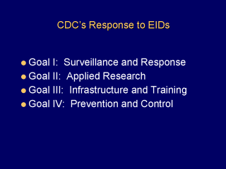 Many international organizations have developed plans of action specific to EIDs. The response by the Centers for Disease Control and Prevention includes four broad goals.