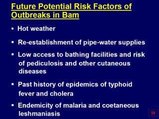 been formally reported in Bam till April 2004. It could be related to over control of provided foods and continuous monitoring of water supplies in the city or non ability of Surveillance System for detecting the small and self-limited outbreaks. Also, the problem of pediculosis is considerable. |