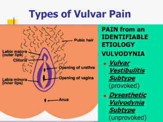 vulvovaginitis, lichen planus, etc. 2. Unprovoked generalized vulvar dysesthesia (also called dysesthetic vulvodynia* or essential vulvodynia), unknown etiology 3. Provoked localized dysesthesia (also called vulvar vestibulitis or vestibulodynia) |
