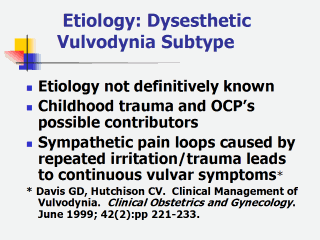 contraceptive use may be independent risk factors. (5) Davis GD, Hutchison CV. Clinical Management of Vulvodynia. Clinical Obstetrics and Gynecology. June 1999; 42(2):pp 221-233. |
