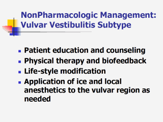 is not a sexually transmitted disease or a malignant condition Patient education and counseling:It is important to provide the patient information brochures on vulvodynia and encourage them to join the National Vulvodynia Association (www.nva.org) which can provide them with education and support. Life style modification: