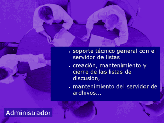 El ADMINISTRADOR de un grupo de discusión por correo electrónico tiene funciones más del tipo "asegurarse que los equipos funcionen donde se maneja la lista". Esta tarea puede ser ardua en LISTSERVERS muy activos y con muchas listas, como en el caso de RedIRIS de España (http://www.rediris.es). |