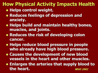 | The evidence is growing and is more convincing than ever! People of all ages who are generally inactive can improve their health and well-being by becoming active at a moderate-intensity on a regular basis. (CDC Report 1997) |