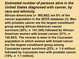 Caucasians in the database for female breast cancer, male prostate cancer and male and female colorectal cancer (3). Possible explanations for these race and ethnicity survival differentials include differential access to screening, optimal treatment or both; variations in screening rates resulting in lead-time bias (greater survival but no change in total life time) and length bias (screening detects slow-growing tumors with better prognosis); and clustering of socioeconomic status and race and ethnicity data (e.g., a delay in treatment or underuse of screening because of low income) (3). Finally, the importance of diverse cultural factors (beliefs, attitudes and knowledge) in influencing prevention and treatment choices must be considered (15). |