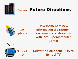 Modern cell phones and PDAs have larger memory storage capacities. Modern cell phones have at least 2 MB of storage and PDA average at about 16 MBs. With the Supercourse lectures being 300 KB each, downloading at least 6 of them into a memory of a cell phone should not be a problem. TV would be a presentation media for a lecture downloaded to a cell phone. Steps of how the system would work: