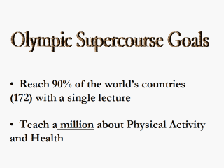 | The potential numbers are staggering. We potentially can reach 90% of the countries of the world with a single prevention lecture. We want to teach at least a million students about physical activity and health. |