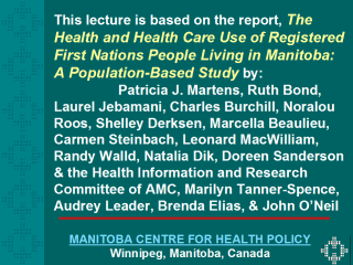 In Manitoba, population-based information helps create an accurate picture of health, the rates of illness, and the way in which people use health care services; this information helps planners meet the health needs of First Nations people. The report highlighted in this lecture, The Health and Health Care Use of Registered First Nations People Living in Manitoba: A Population-Based Study represents a first attempt to provide such information. It is based on the entire population of the province of Manitoba; all other Manitobans serve as a comparison group to Registered First Nations people. Although this research is Manitoba-specific and made possible because of the rich, population-based data available to us, the approaches, measures, and findings can be used to guide research elsewhere and inform a better understanding of health and health care among various population groups.
