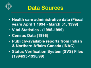 The majority of the data used came from administrative data  from the Population Health Research Data Repository (PHRDR)  housed at the Manitoba Centre for Health Policy. Five fiscal years of administrative data were used - April 1, 1994 through March 31, 1999. Supplementary data came from Vital Statistics  (death rates), Canadian Census  (determinants of health: education, household income, and employment), and INAC Reports (housing within Tribal Council areas)
