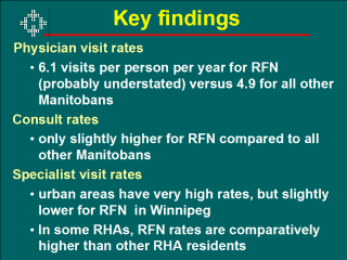 The Tribal Council area of DOTC (in southern Manitoba) has the poorest health status, supposedly good access to Manitoba’s largest cities, yet has the lowest consult rate of all TC areas. In contrast, the remote Island Lake TC has one of the highest consult rates. Looking at the total number of visits to specialists (the first "consult" and subsequent visits), Winnipeg has the highest rates in the province both for RFN and for other Winnipeggers (1.6 RFN vs 1.7 all others), followed by areas in close proximity to the major urban centres (i.e. Brandon, Interlake, North Eastman) . These do not appear to be particularly needs driven, showing higher rates for other Manitobans than for RFN. Six RHAs do show higher specialist visit rates for RFN compared with other residents in the region: Churchill, Nor-Man, Burntwood, Parkland, Marquette, South Westman. |