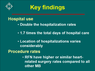 Some northern Tribal Council areas tend to use hospitals within local RHAs, whereas others use Winnipeg hospitals. But large differences in location of hospitalization exist even for two northern remote Tribal Councils. Over 70% of KTC hospitalizations occurred within their RHA, compared to only around 20% for ILTC (most ILTC occurred in Winnipeg). For a closer look at hospital use, several high-profile procedures were also measured. Only one example is presented here. Because heart-related conditions are often associated with diabetes one would expect higher cardiac surgery or diagnostic rates for RFN. In fact, RFN people do have higher or similar heart-related surgery rates. For example, for the diagnostic test called cardiac catheterization, RFN rates are 3.5 per 1000 compared to 2.7 for all other Manitobans. |