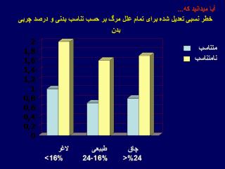 چاقی و عدم تناسب فیزیکی با تمام علل و مرگ های ناشی از بیماری عروق کرونر ارتباط دارند. در مقایسه با زنان متناسب و غیر چاق Adjusted cox proportional hazard ratio برای تمام علل مرگ در افراد متناسب و چاق (1.32 و 0.05> P)، غیر متناسب و عیر چاق (1.30 و 0.05> P) و غیر متناسب و چاق(1.57 و 0.05> P) بیشتر است. Blair SN: Cin J Sport Med. 2003 Sep;13(5):319-320