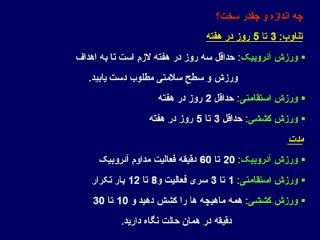 آئروبیک: 20 تا 30 دقیقه نرمش آئروبیک مداوم. توجه: نشان داده شده است که فعالیت های متوسط در طی روز اثرات چشمگیری را برای سلامتی به همراه دارد.