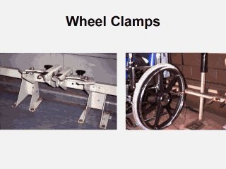 | Pictures show the side ways installed wheel clamp system, which is not recommended, because the wheel can come detached from the wheelchair during impact and the occupant is sideways facing, which is a non safe position during frontal impact. |