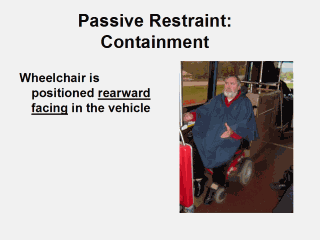 | Pictures of a flip up seat and ‘ironing board’ that function as a rearward facing back stop for wheelchair users traveling in low g (low speed) vehicles such as public buses. |