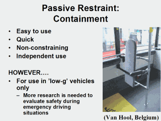 | Pictures of an ‘ironing board’ that functions as a rearward facing back stop for wheelchair users traveling in low g (low speed) vehicles such as public buses. |