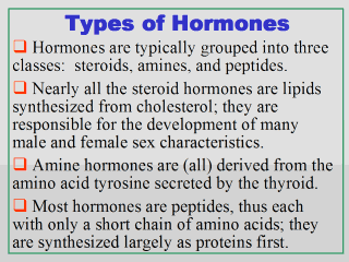 amines, and peptides. All the steroid hormones, except retinoic acid, are lipids synthesized from cholesterol through a series of biochemical reactions. 17b -Estradiol is perhaps one of the few most discussed hormones in this group, as it is the active form of estrogen responsible for the development of many female sex characteristics. Testosterone, having a structure similar to estradiol, is an androgen responsible for the development of many male characteristics. These steroids are referred to as sex hormones and are secreted by the adrenal cortex, the placenta, and mostly the gonads. Some other steroid hormones are aldosterone, corticosterone, and progesterone. Amine hormones are (almost) all derived from the amino acid tyrosine. They are secreted by the adrenal medulla but largely by the thyroid, and are typically stored as granules in the cytoplasm until needed. Epinephrine and thyroxine are the notable ones in this group. Most hormones are peptides, thus each having only a short chain of amino acids. They are secreted by several tissue organs including the pituitary, parathyroid, heart, stomach, liver, and kidneys. Many hypothalamic factors (e.g., gonadotropin- and growth hormone-releasing hormones) and pituitary hormones (e.g., growth hormone, thyroid-stimulating hormone) belong to this peptide group. Also included in this group are insulin and glucagons. These peptide hormones are synthesized largely as proteins on the ribosomes first, and then cleaved into the size of amino acids. Some of them also serve as neurotransmitters. |
