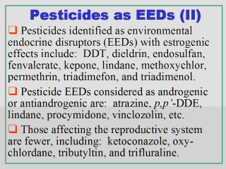 The reproductive system is the last of the more prominent places in the body where pesticides and other persistent organochlorines are listed on the website as having the ability to disrupt hormone levels. Endocrine disruptors in this group include the pesticides ketoconazole, oxychlordane, tributyltin, and trifluralin, and the non-pesticides BHC (benzenhexachloride), 1,2-dibromoethane, chloroform, PCBs, carbendazim, lead, and mercury.