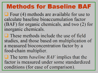 provided by U.S. EPA (Code of Federal Regulations, 2003). In essence, four assessment methods are available for calculating the baseline BAFs for organic chemicals. These are: (1) the baseline BAFs measured from field studies; (2) the predicted baseline BAFs from using biota-sediment accumulation factors; (3) the predicted baseline BAFs each from multiplying a laboratory-measured BCF by a food-chain multiplier (FCM); and (4) the predicted baseline BAFs each from multiplying a predicted BCF by a FCM. FCM is defined as the ratio of a BAF to an appropriate BCF. For inorganic chemicals, BAFs are derived from using either (1) field-measured BAFs or (2) by multiplying the BCFs by a FCM. For most inorganics, the FCM is assumed to be 1. The terms baseline BAF and baseline BCF imply that the factors (ratios) are measured under certain standardized conditions for ease of comparison. For organic chemicals, the baseline BAF and the baseline BCF are each based on the concentration of freely dissolved chemical in the surrounding medium (e.g., water) and take into account the partitioning of the chemical within the organism. For inorganic chemicals, the baseline BAF and the baseline BCF are each based on the wet weight of the organism’s tissue (Code of Federal Regulations, 2003). |