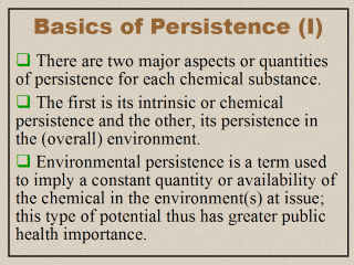 chemical further available for exposure. Once again and in the simplest term, bioaccumulation is an increase in concentration of a pollutant in tissues in excess of what is normally expected. An extensive discussion of this concept can be found in Part II. A chemical’s persistence in an environment is, on the other hand, reflected by its susceptibility to degradation or loss in that environment. There are two major aspects or quantities of persistence for each chemical substance. The first is its intrinsic or chemical persistence and the other, its persistence in the environment. Strictly speaking, chemical persistence refers to a substance’s ability to remain unchanged in its natural physiochemical state and composition over time. Such an ability is nonetheless still influenced greatly by the immediate environmental conditions the substance is in. Environmental persistence is a term or a concept typically used to imply a constant quantity or availability of the substance in the environment(s) of concern. That is, even an extremely persistent substance would pose no threat of environmental persistence if it were kept inside a durable well-sealed, well-insulated container all the time. |