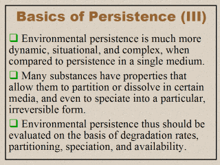 various trophic levels (i.e., in various positions of the food chain). It is important to distinguish between a chemical’s persistence in a single (environmental) medium and its overall environmental persistence. Although persistence in a single medium is still influenced by the conditions of the immediate environment, environmental persistence is much more dynamic, situational, and complex in that the environment is now viewed as behaving like a set of interconnected media. Many substances have properties that allow them to partition or dissolve in certain media. Partitioning is the tendency of a substance moving from one medium to another in response to thermodynamic processes (or loosely, some natural forces). If and when partitioning takes place, the chemical may be in a different species not convertible back to its original form. Thus one other crucial physicochemical property of a substance is its tendency to speciate into a particular form (Mackay et al., 2001). In some cases, speciation is irreversible, such as the conversion of DDT to p,p’-DDE. Another concept related to chemical’s persistence is its availability in the medium or in the overall environment. Persistence of a chemical in the environment hence should be evaluated on the basis of degradation rates, partitioning, speciation, availability, and an appreciation of which media are relevant and irrelevant. |
