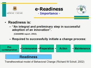 (Scholl RW, 2002) Precontemplation is the stage at which there is no intention to change behavior in the foreseeable future. Contemplation is the stage in which individuals are deciding whether or not there is a need to take action to correct the problem. Do the pro & cons of change outweigh the pro & cons of maintaining the status quo? Preparation is a stage entered into once the individual decides there is a need to take some action. Specific plans of action are developed in this stage as the individual chooses among alternative potential solutions. Action is the stage in which individuals put their plans into action and change their behavioral patterns. Maintenance is the stage in which people work to prevent relapse and consolidate the gains attained during action. |