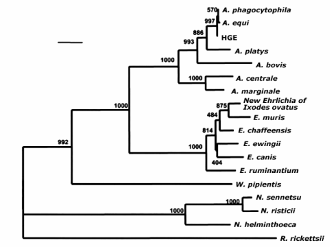 Inokuma et al. This cluster analysis shows phylogenetic relationships among A. centrale and various Ehrlichia spp. based on the 16S rRNA gene sequences using program Clustal W to construct the phylogenetic tree. The scale bar represents 1% divergence. The numbers at nodes are the proportions of 1,000 bootstrap resamplings that support the topology shown. This most excellent nucleotide sequencing is by Inokuma H, Terada Y, Kamio T, Raoult D, and Philippe Brouqui P. 2001. Analysis of the 16S rRNA gene sequence of Anaplasma centrale and Its phylogenetic relatedness to other Ehrlichiae. Clin Diagn Lab Immunol, 2001, 8: 241-244. |