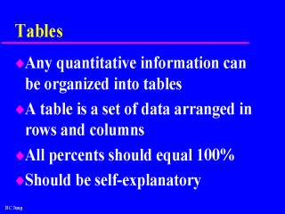 context or a structure with which you organize your data (or observations). Tables are useful for demonstrating patterns, exceptions, differences and other relationships. Everything on a table should be labeled - rows and columns should have units of measurement, and totals. All codes, abbreviations, symbols, exclusions, data sources should be explained in a footnote. If a table is set up right the data can speak for themselves. If the table is part of a report it should still make sense by itself even if it got separated from the report. You can always describe data with a narrative, but you would be expecting a lot from your audience to digest numbers and words, when a table can summarize data more succinctly. |