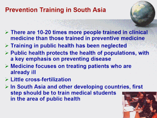 | Public health protects the health of populations, with a key emphasis on preventing disease and promoting better health, whereas medicine focuses on treating individuals who are already ill. In developing countries, a first step should be to train medical students to a much greater degree in the area of public health. |